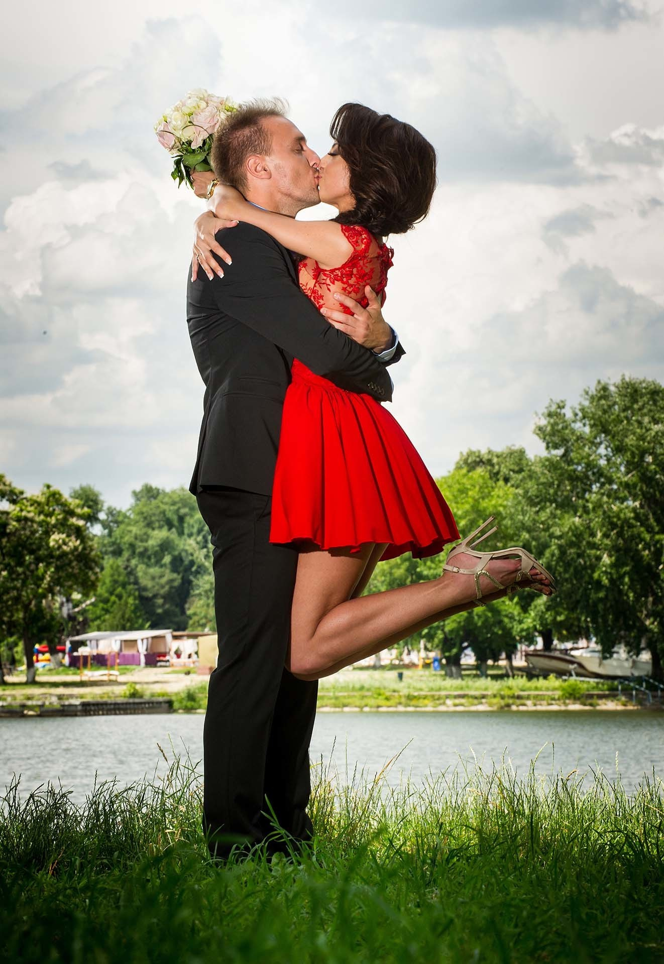 Romantic Kiss and Lift Engagement Photo by the River