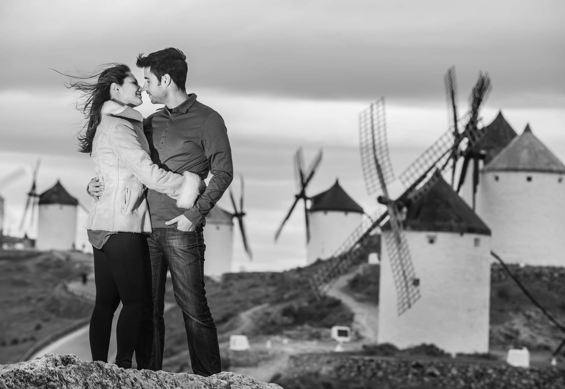 Dramatic Windmill Engagement Portrait in Black and White Toledo, Spain